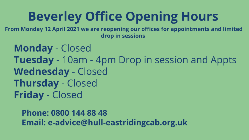 ©2020 Hull & East Riding Citizens Advice is an independent registered charity providing free, confidential and impartial advice, information and representation services to the residents of Hull and East Riding.