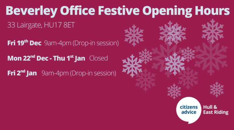 Read moreBeverley Office33 LairgateBeverleyHU17 8ET Opening Times Friday 19th Dec: 9am-4pm (Drop-in session) Monday 22nd Dec – Thu 1st Jan: Closed