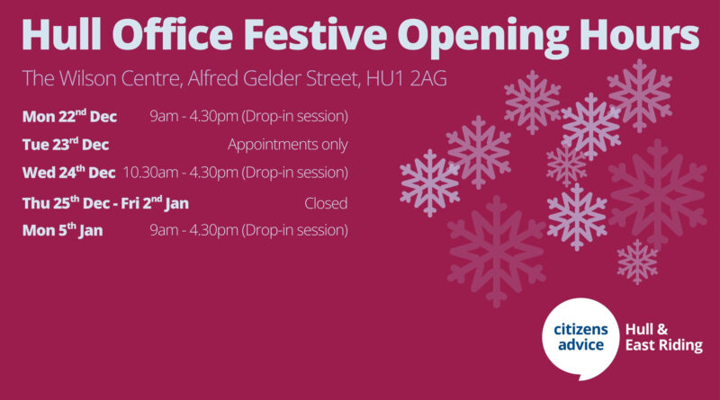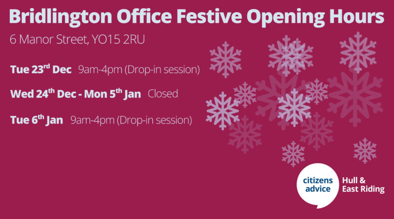 Read moreBridlington Office6 Manor Street,Bridlington,YO15 2RU Opening Times Tues 23rd Dec: 9am-4pm (Drop-in session)Wed 24th Dec – Mon 5th Jan: ClosedTue 6th