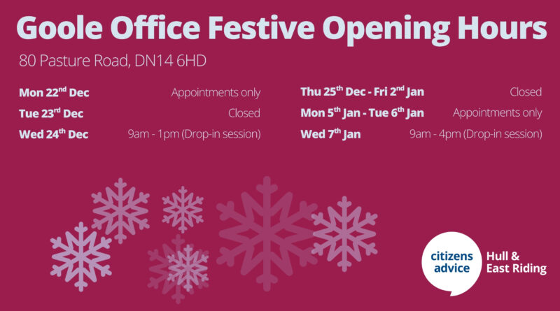 Read moreGoole Office80 Pasture Road,Goole,DN14 6HD Opening Times Mon 22nd Dec: Appointments only Tuesday 23rd Dec – Closed Wednesday 24th Dec